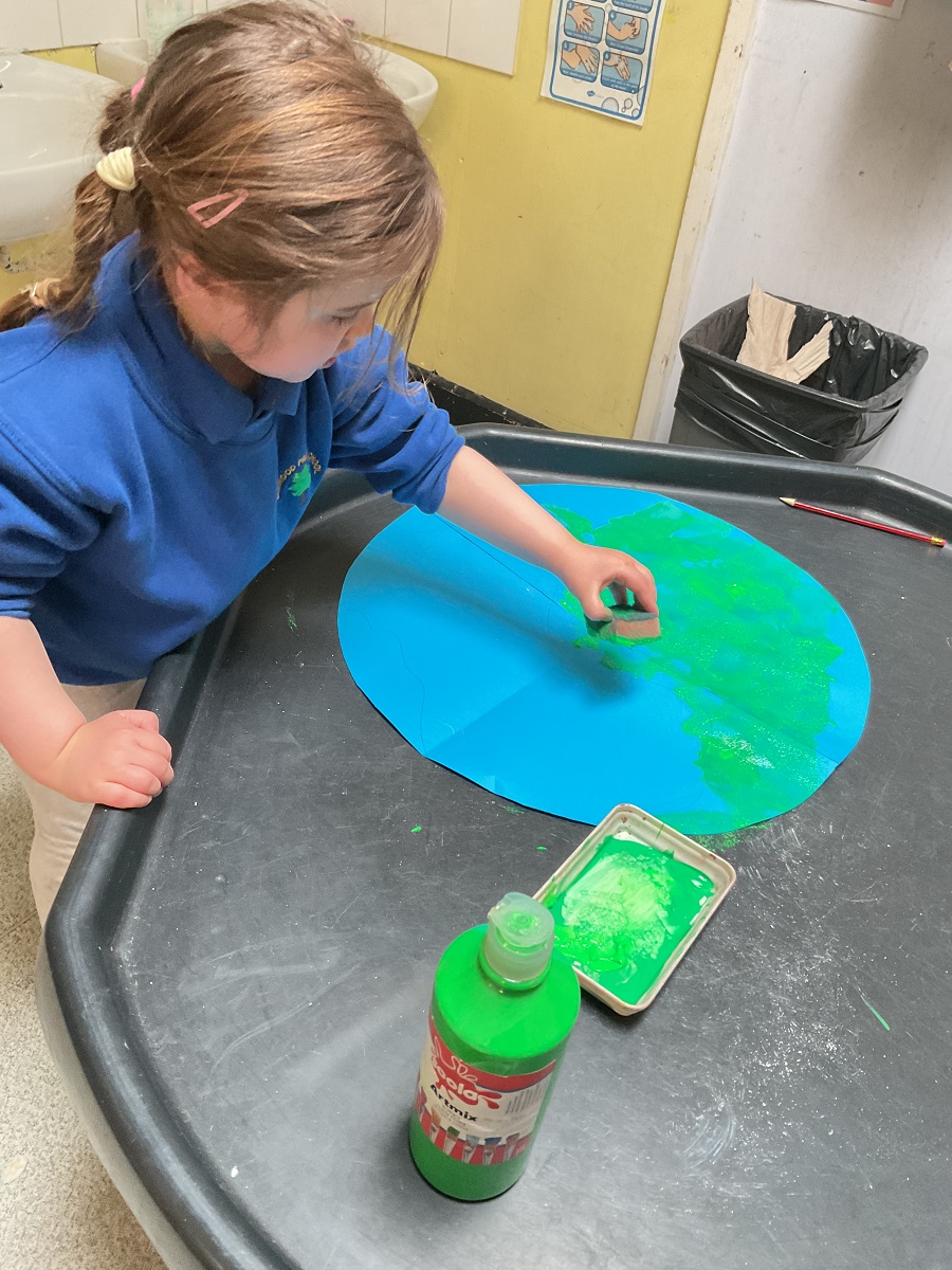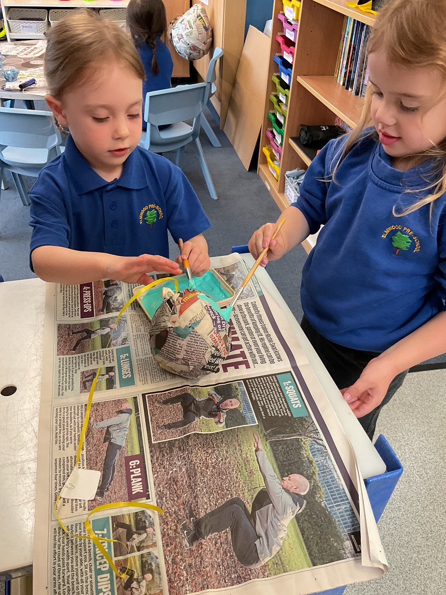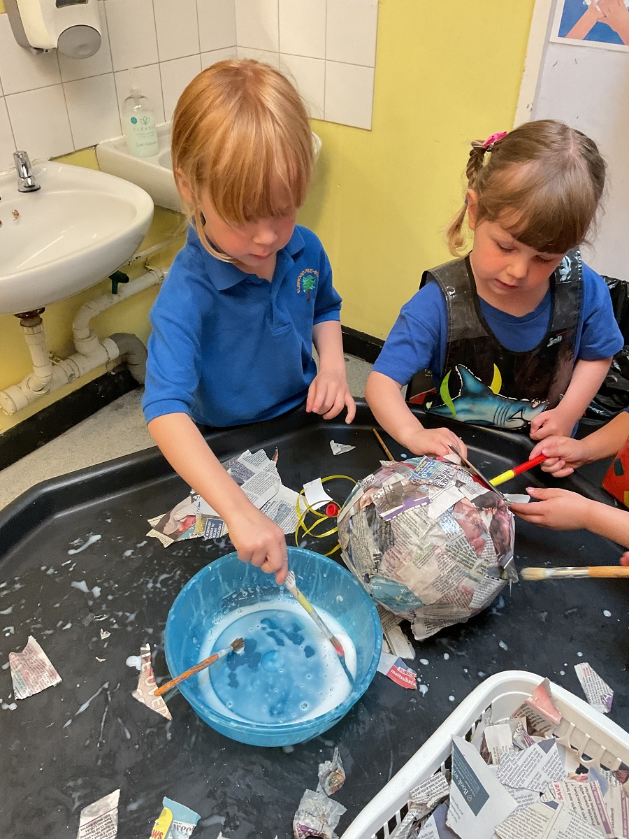 During PE they pretended to be the different planets moving around the sun. They learnt the names, as well as making, and placing them in order from the sun. The children made paper mache planets, sang songs and lots of other activities.