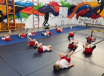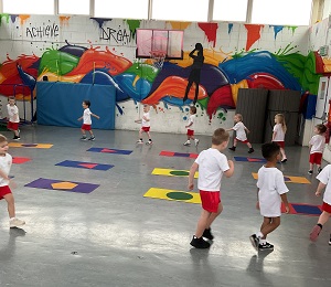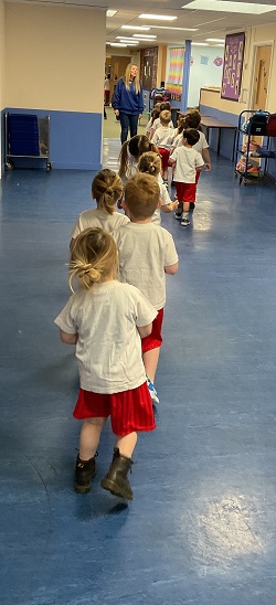 The children walked through the primary school, down to the school gym, where they did running and lots of different exercises on the floor mats. They talked about the impacts that exercise has on their bodies, e.g. sweating and faster heart rate, and in session they talked about why exercise is good for us.